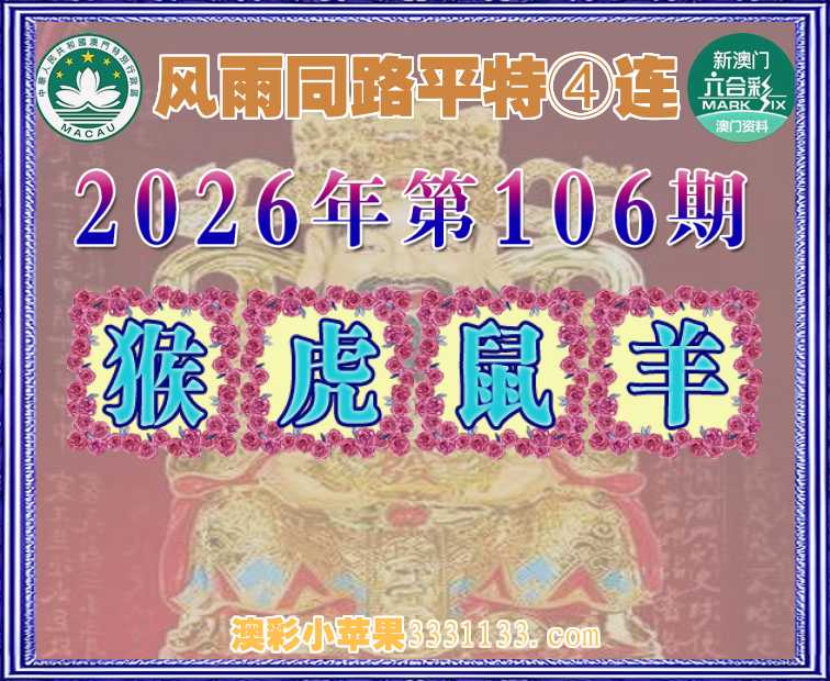 106期:『风雨同路』 平特④连【猴虎鼠羊】开:猴11,虎05,鼠31,羊48